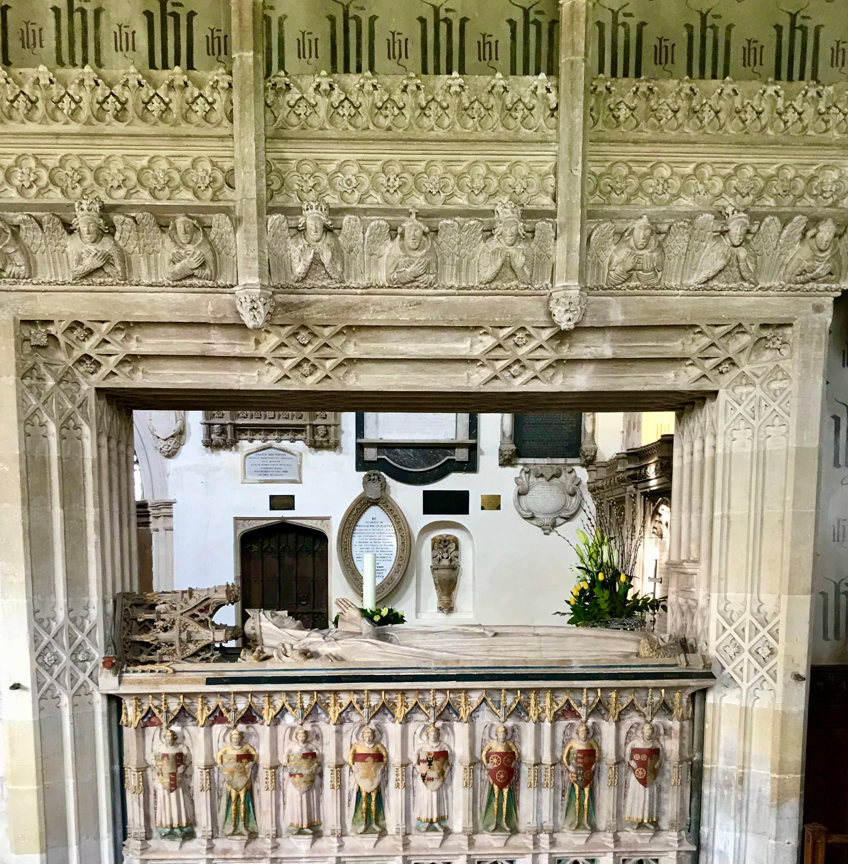 The side chapel where she is buried has a curious array of church furnishings that include the original medieval floor tiles, a gaudy turn-of-the-century alter piece adorned with English saints, the sole surviving medieval seat and fabulous IHS monogrammed walls. The tomb dominates the space in a style and manner usually reserved for a Knight and his Lady. Arranged over three levels, from the most elaborate and celebratory at the top to the realistic effigy of the occupant in her funeral shroud at the very bottom. She is buried alone as her third husband suffered a ghastly traitors fate and is buried far away in Suffolk, so she had to make do with adoring cherubs instead.